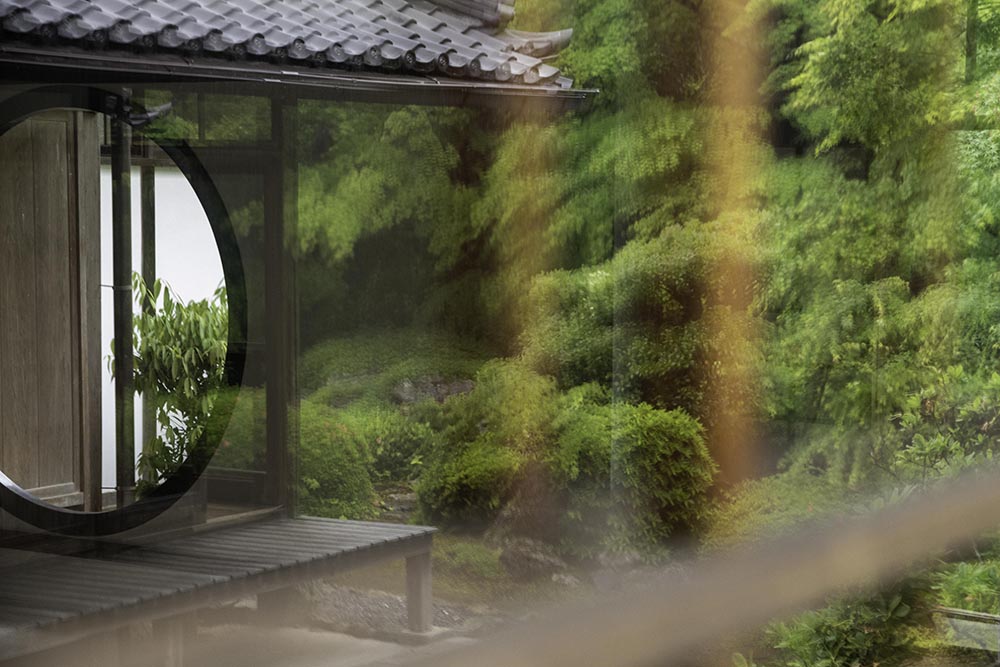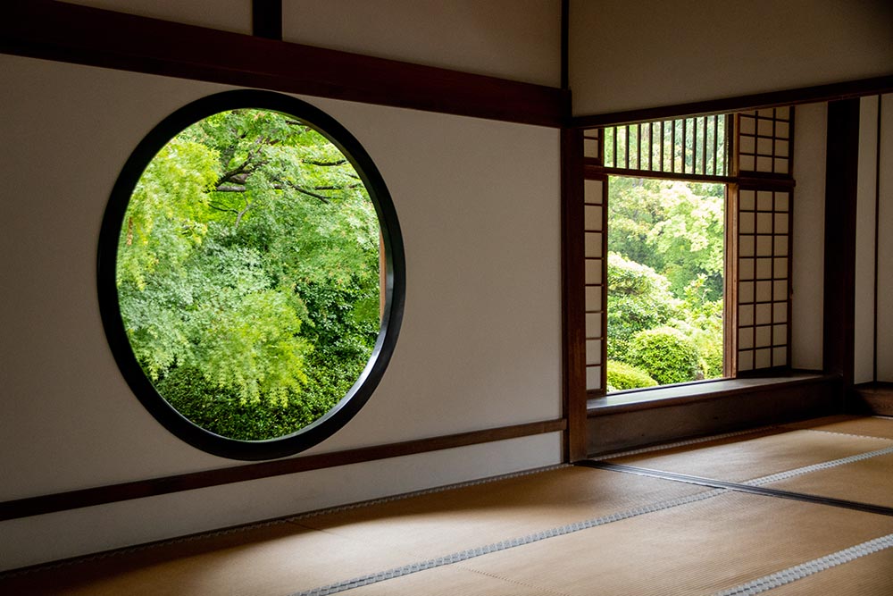 鷹峯にある曹洞宗のお寺。悟りの窓の円型は「禅と円通」の心を表し、円は大宇宙を表現しています。 迷いの窓の角型は「人間の障害」を象徴し、生老病死の四苦八苦を表します。