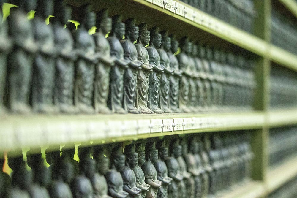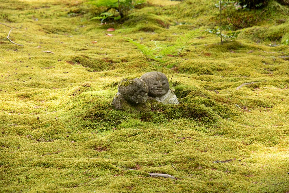 苔庭の所々にわらべ地蔵がいる